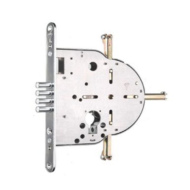 Installed inside wood or metal doors to provide 4-way multi-bolt locking.