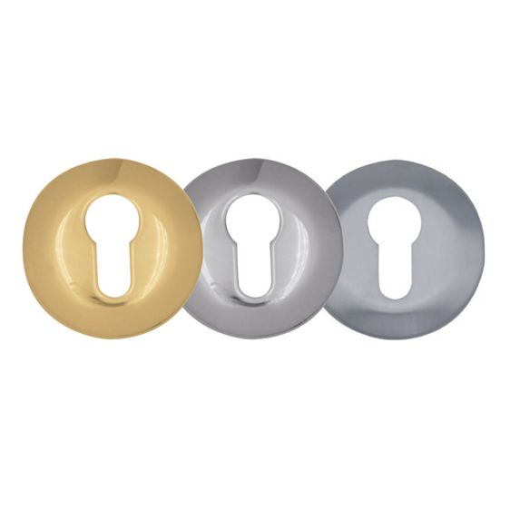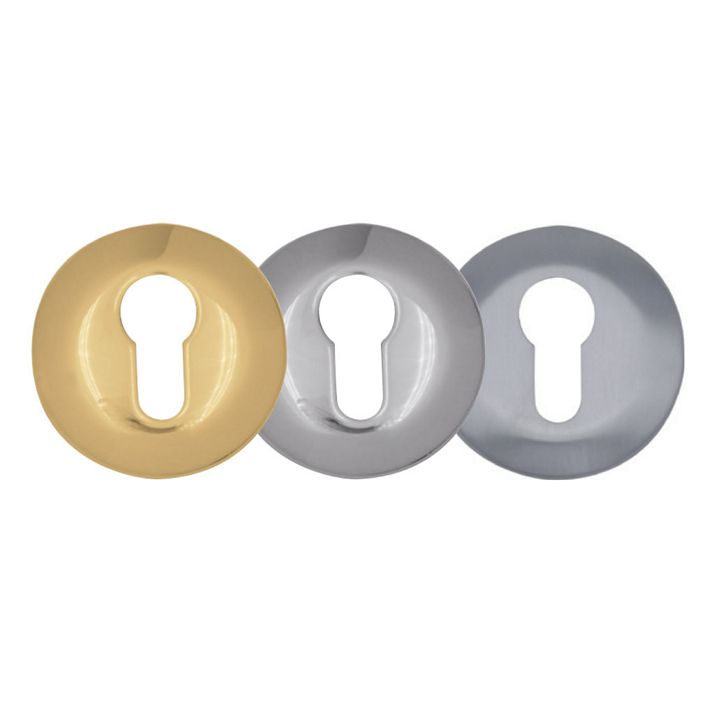 Le bocchette tonde di protezione del cilindro delle serrature CE sono disponibili in 3 finiture (Ottone lucido, Cromo lucido, Cromo satinato) e predisposte con foro per cilindro oppure con foro per pomolo o codolo.