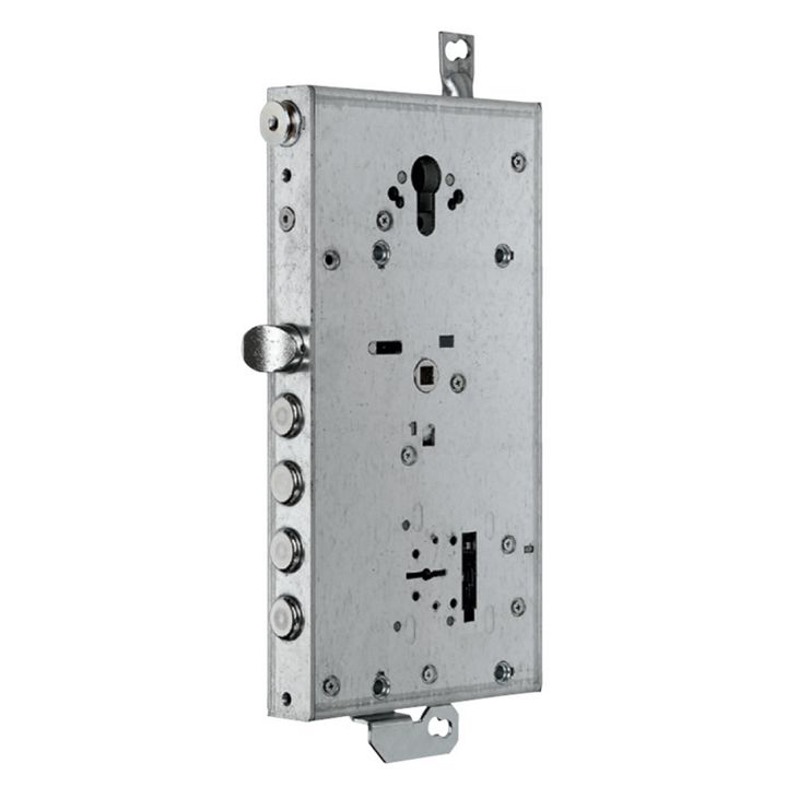 - Triplice chiusura a doppia mappa a 4 mandate con scrocco Ø 20 mm azionato da chiave e da quadro maniglia 8 • Serratura di servizio a cilindro europeo a 2 mandate con chiavistello tondo Ø 18 mm