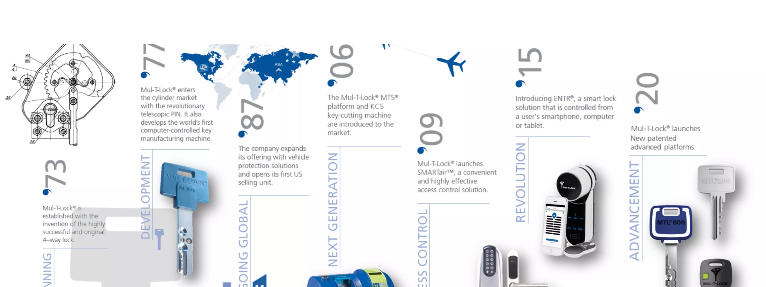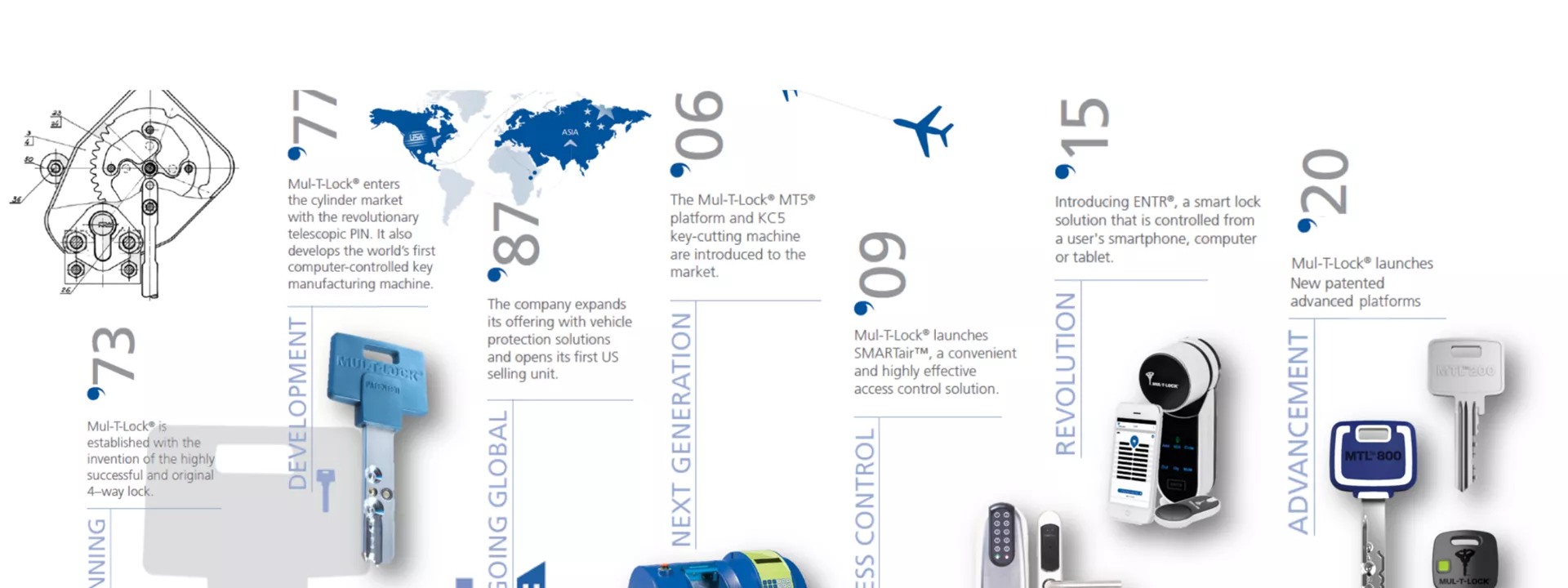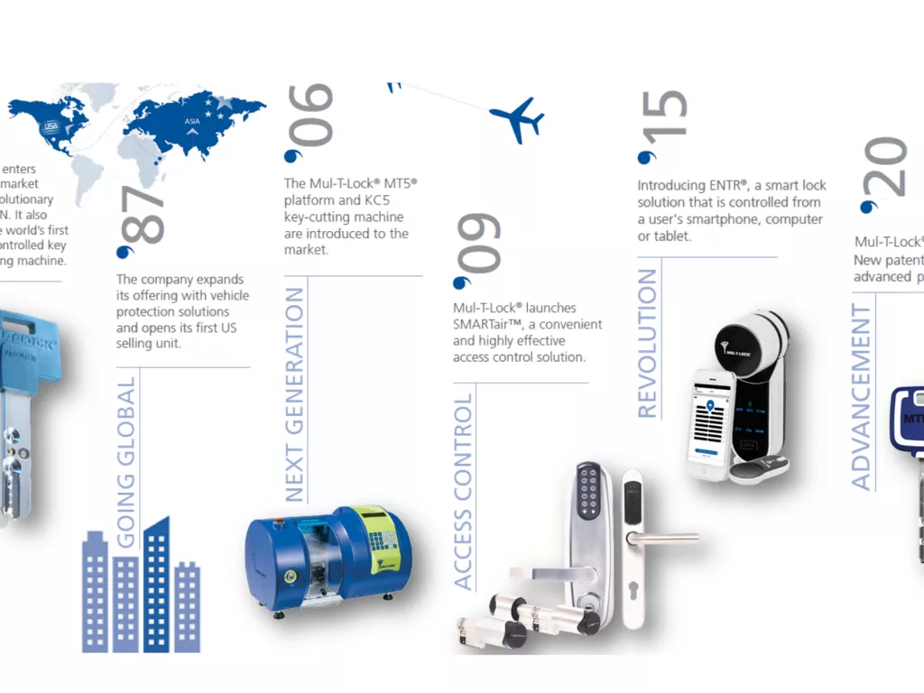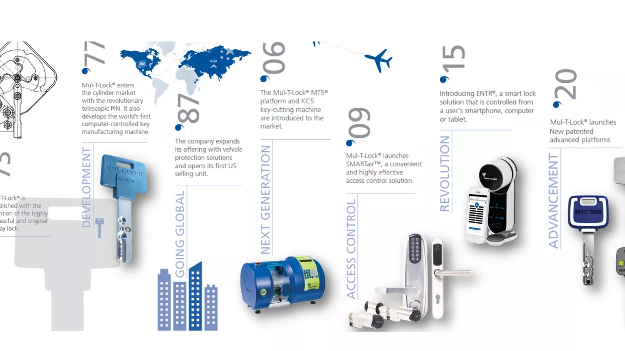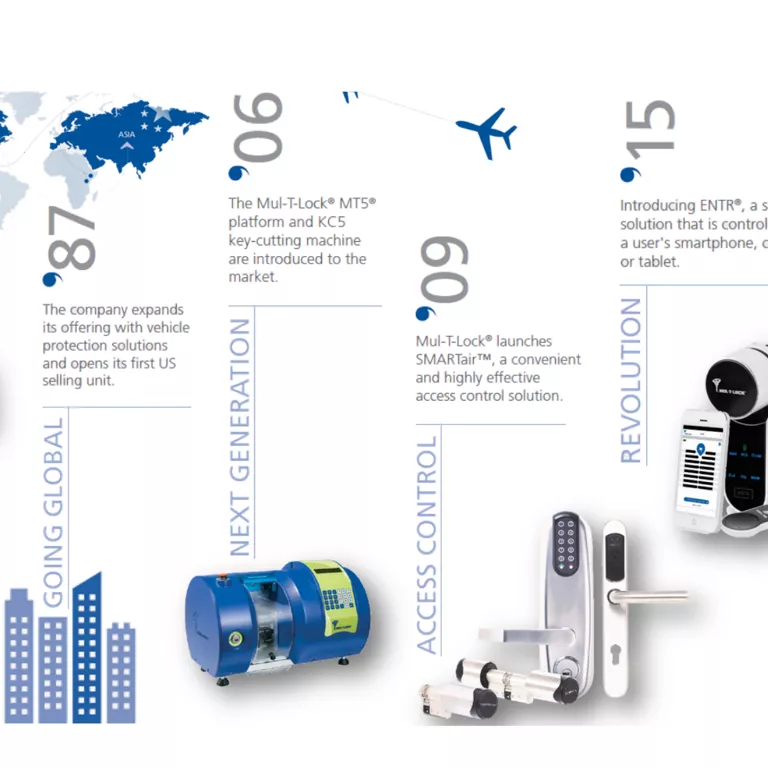 In the years that followed, Mul-T-Lock has further expanded its global reach; with European sales units and its entrance into the Asia Pacific market. It also began to broaden its operations by manufacturing automatic key-cutting and assembly machines for external customers.