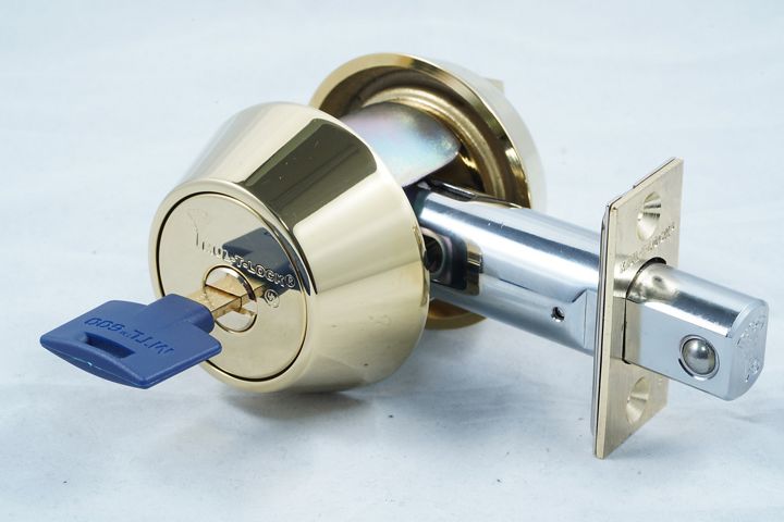 90˚ key rotation throws the bolt 1" towards the frame, interlocking two hardened ball bearings with the strike to increase jimmying resistance.